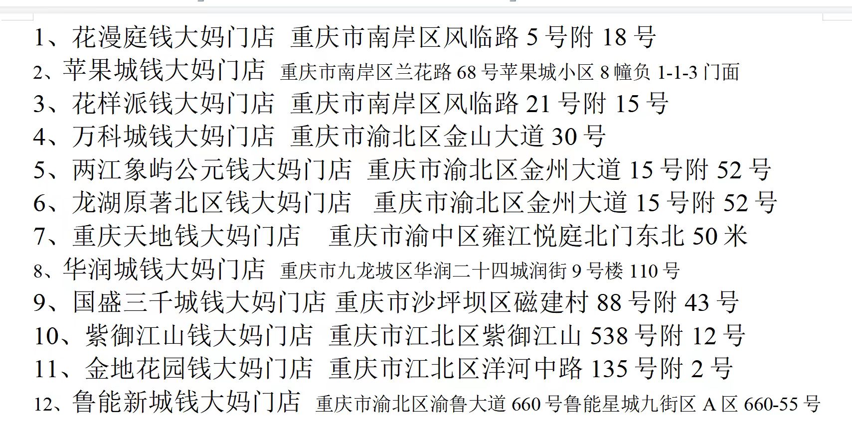 首次上店銷售的門店有12家,名單如下,歡迎各位重慶的朋友到店選購。