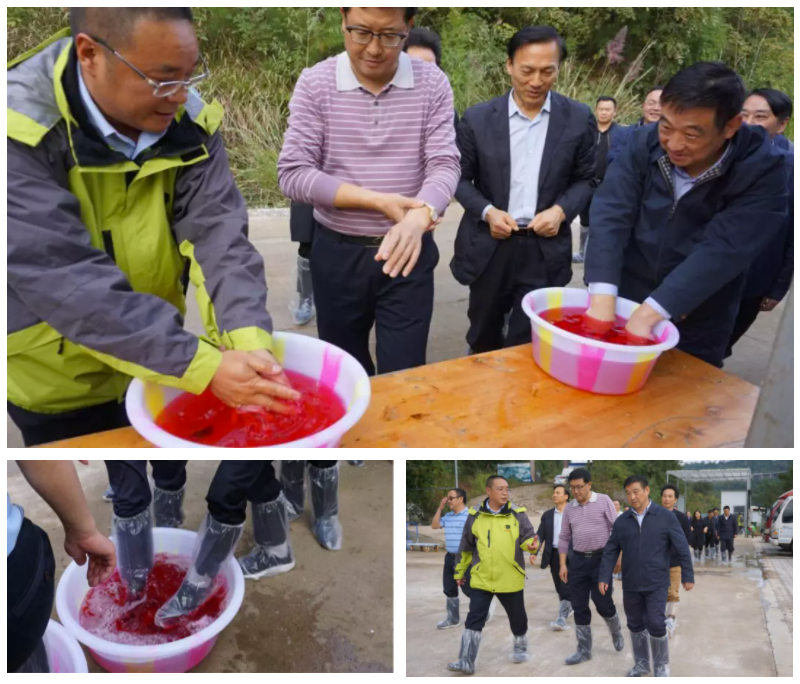 巴山牧業(yè)董事長張育賢先生詳細(xì)介紹非洲豬瘟期間我司的防控措施,一次性參觀鞋套,消毒水浸泡水、腳等,并嚴(yán)格消毒三分鐘。進(jìn)入園區(qū)參觀。